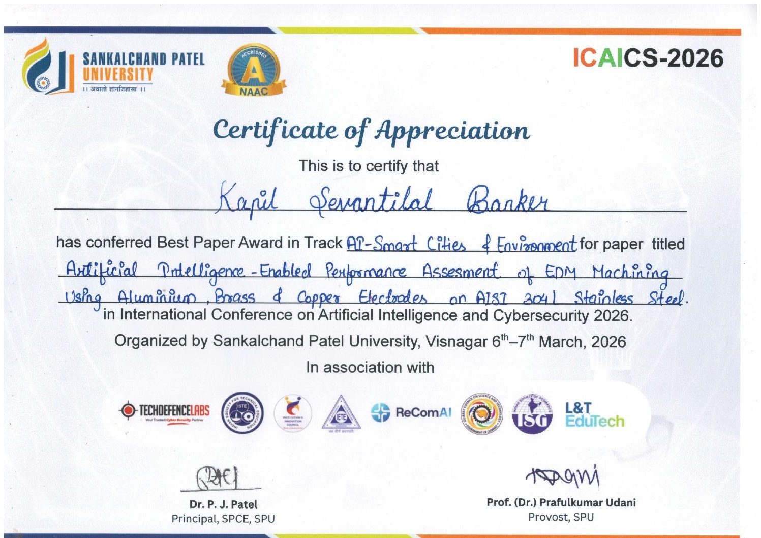 - Received Best Research Paper Award for the Research Paper “Artificial Intelligence-Enabled Performance Assessment of EDM Machining using Aluminium, Brass & Copper Electrode on AISi 304L Stainless Steel” at Inernational Conference on Artificial Intelligence and Cybersecurity 2026. Date 06-07 March 2027.
